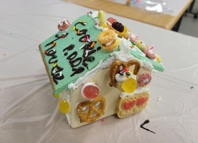 과자로 벽들을 세우고 지붕을 이어 주고 여러 가지 먹을 수 있는 재료들로 단장하여 예쁘고 멋있는 "Cookie House"를 완성했어요.